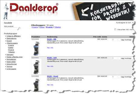 www.daalderop.se/butik för företag Vi hoppas att med tillägg av en webbutik kunna öka servicenivån till våra kunder. Butiken kommer att byggas ut allteftersom. Vi har inte för avsikt att belasta butiken med några kostnader som till slut måste läggas på våra priser och därmed våra kunder. Vi har istället valt att göra butiken enkel och lättöverskådlig. Det saknas ännu en del innan vi är nöjda och vi hoppas du har överinseende för det. Alla våra produkter kommer inte att vara med från början så hittar du inte vad du söker i butiken så ring oss på 0498-493230. |